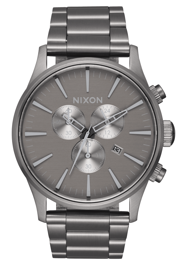 A timeless 42 mm design with the modern Nixon twist of faceted applied hour indices